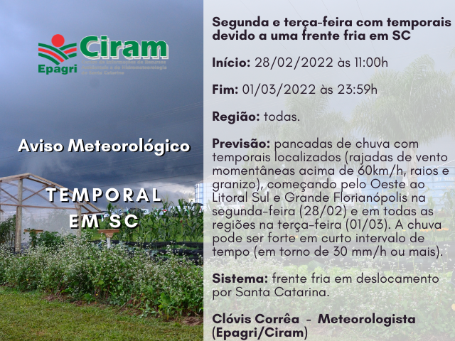 Previsão: pancadas de chuva com temporais localizados (rajadas de vento momentâneas acima de 60km/h, raios e granizo), começando pelo oeste ao litoral sul e Grande Florianopolis na segunda-feira (28/02) e em todas as regiões na terça-feira (01/03). A chuva pode ser forte em curto intervalo de tempo (em torno de 30 mm/h ou mais).