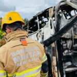 Após o impacto da rocha, segundo a PRF, o ônibus se incendiou. Um carro também se chocou contra a carreta e seus três ocupantes ficaram gravemente feridos.