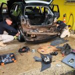 A vistoria veicular encontrou indícios de adulteração na lataria do piso do porta-malas. Com uso de ferramentas e depois de três horas de trabalho, os policiais retiraram de um compartimento secreto 32 pacotes de crack, droga derivada da cocaína.