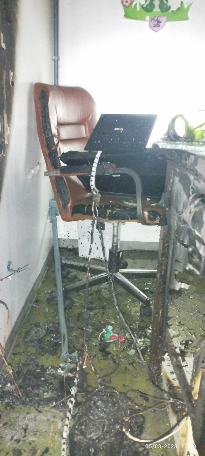 Ao abrir a sala percebeu-se que a parede, uma mesa, cadeira e o computador foram danificados pelo calor sendo usado extintor tipo (CO2) para o resfriamento e controle do calor.