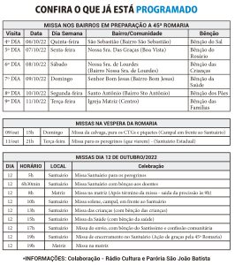 Já nesta última segunda-feira, 03/10, iniciou a programação de missas nos bairros da cidade, começando na capela Nossa Sra. Consoladora dos Aflitos, na Cohab Integração, com a Bênção da Água; na terça-feira, 04/10, foi a vez da comunidade de Nossa Sra. De Fátima, no Bairro Jardim Bela Vista, com a Bênção das Velas; e ontem, quarta-feira, 05/10, a imagem chegou à capela São José Operário, no Bairro Aparecida, com a Bênção das chaves. Ao todo, a novena vai percorrer nove diferentes comunidades, até chegar à Matriz.