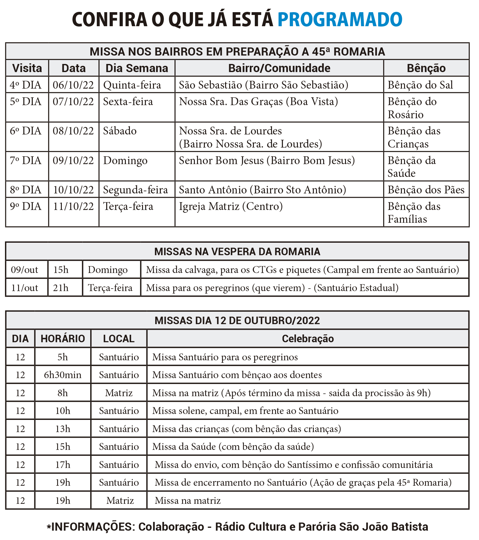 “Estamos na expectativa de acolher muita gente, pessoas que gostariam de ter vindo participar nos últimos dois anos e não puderam, certamente virão neste ano prestigiar a nossa romaria. Por isso, fizemos uma programação espiritual para o dia 12, que inicia às 5h da manhã e se estende ao longo do dia, com celebrações na Matriz e no Santuário Estadual”, afirmou o Padre.
