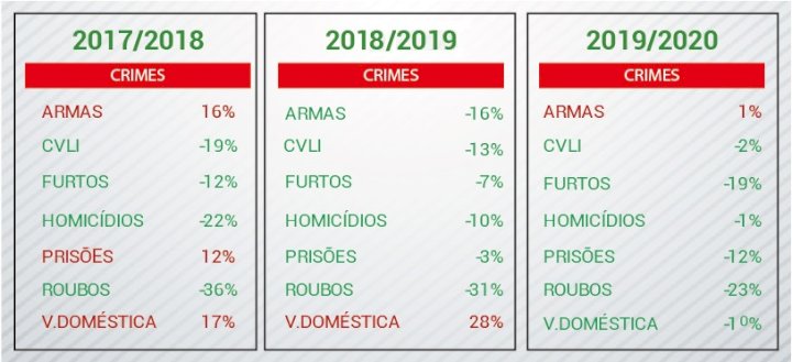 Segundo a PM, a comparação revela uma queda expressiva na criminalidade. O índice de furtos também teve redução expressiva, de 19% quando comparado com 2019. Conforme o levantamento da PM, também houve bons resultados nos crimes envolvendo violência doméstica, que tiveram uma queda de 10% em relação ao ano de 2019.