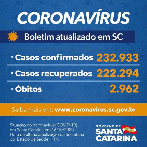 Santa Catarina já registrou 232.933 pacientes com confirmação de infecção pelo novo coronavírus, dos quais 222.294 estão recuperados e 7.677 permanecem em acompanhamento. O número foi divulgado nesta sexta-feira, 16. Desde o início da pandemia, 2.962 óbitos foram causados pela doença respiratória. A taxa de letalidade é de 1,27%.
