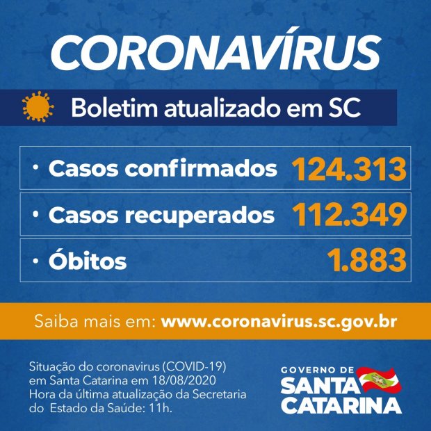 Há, em Santa Catarina, 124.313 casos confirmados de Covid-19, dos quais 112.349 estão recuperados e 10.081 permanecem em acompanhamento. O balanço foi divulgado nesta terça-feira, 18. Desde o início da pandemia, 1.883 óbitos foram causados pelo coronavírus. Esses números colocam a taxa de letalidade em 1,51%.