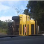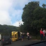 A PRE faz os levantamentos. O outro flui um pouco lento devido à presença do caminhão sobre a pista da direita de quem segue a Capinzal. Um guincho deverá ser acionado para providenciar a retirada do caminhão que estava carregado de canos de PVC. Parte da carga caiu da carroceria.