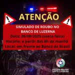 Na próxima sexta-feira (26), a partir das 6h, durante o Curso de Ações Integradas de Defesa, será realizado um SIMULADO de ocorrência policial de roubo a instituição bancária, frente ao Banco do Brasil no centro de Luzerna.