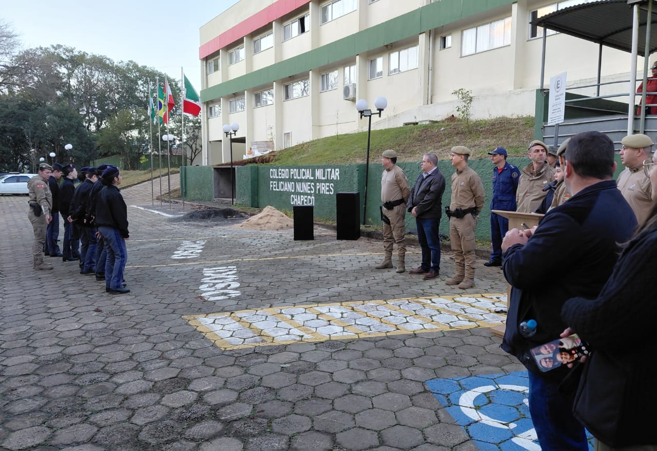 Na solenidade de sexta-feira, o diretor do colégio, major José Luís Valério, assinalou a participação ativa de professores, policiais militares, alunos e familiares e a atuação com empatia, respeito e compromisso. Já o diretor da Academia de Polícia Militar, coronel Cleber Pires, lembrou que a implantação do colégio, inaugurado em 7 de fevereiro deste ano, resultou da ampla articulação da comunidade de Chapecó e disse que são necessários novos esforços para o contínuo crescimento da escola. Também assinalou três fatores que considera fundamentais na atuação do Colégio Policial Militar, que são a dedicação dos alunos, o apoio familiar e o esforço dos profissionais envolvidos.