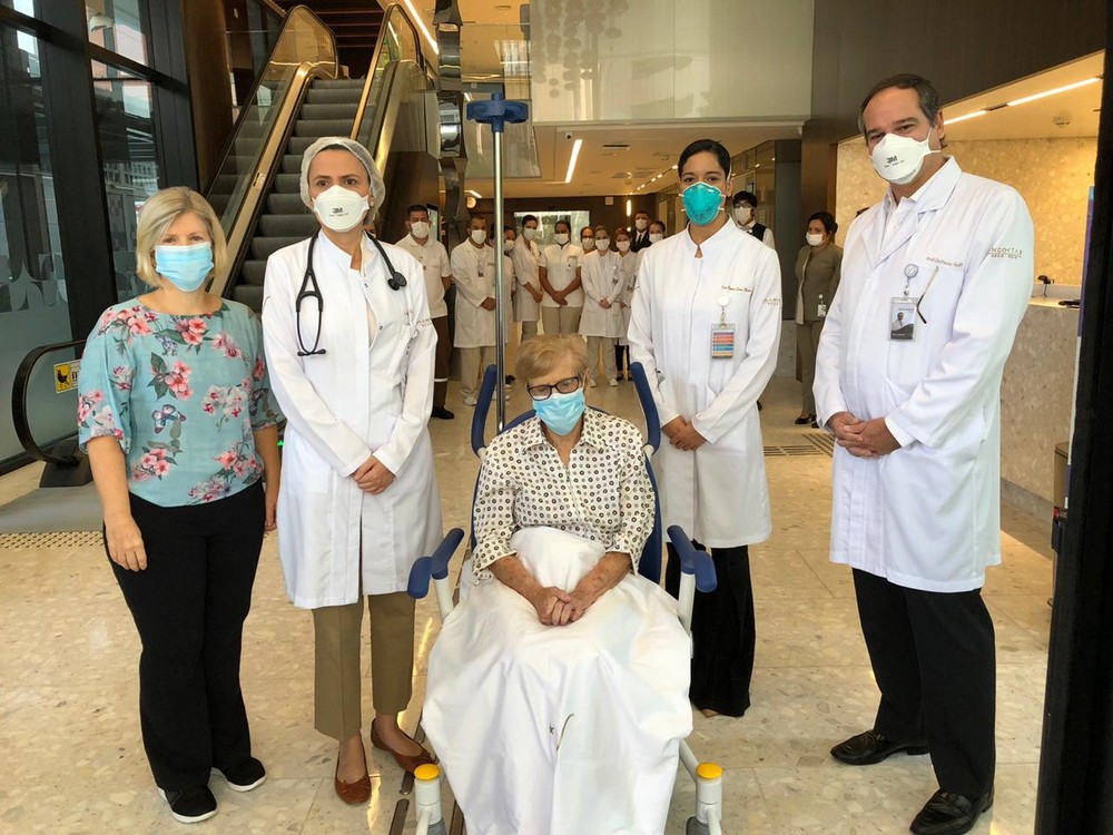 Com seis netos e cinco bisnetos, a nonagenária deixou o hospital sob aplausos dos profissionais.
