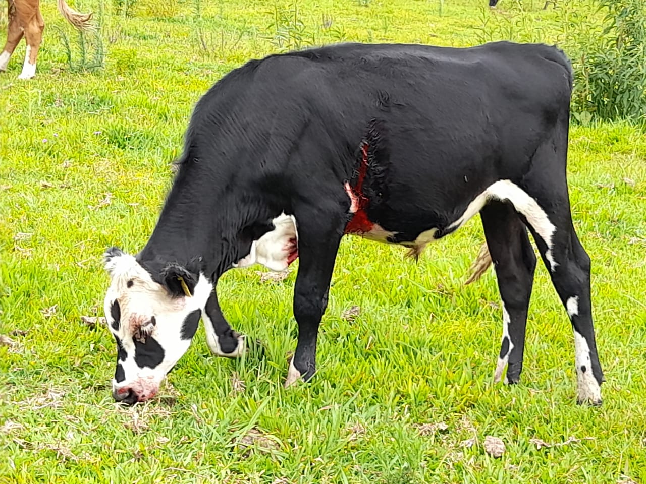 Ele relatou que o animal havia sido atingido por algum objeto cortante e que estava sangrando. Próximo ao bovino havia uma barra de ferro afiada, possivelmente usada para ferir o animal que sobreviveu e foi medicado.