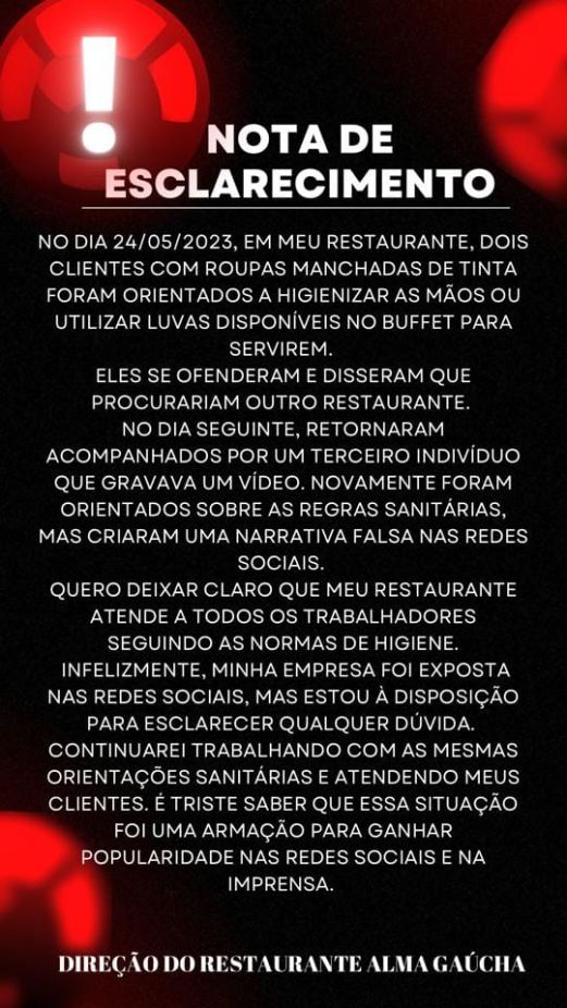 Após a repercussão do caso, o restaurante, que fica localizado no Centro de Chapecó, emitiu uma nota em suas redes sociais, se posicionando sobre o ocorrido.