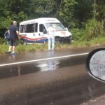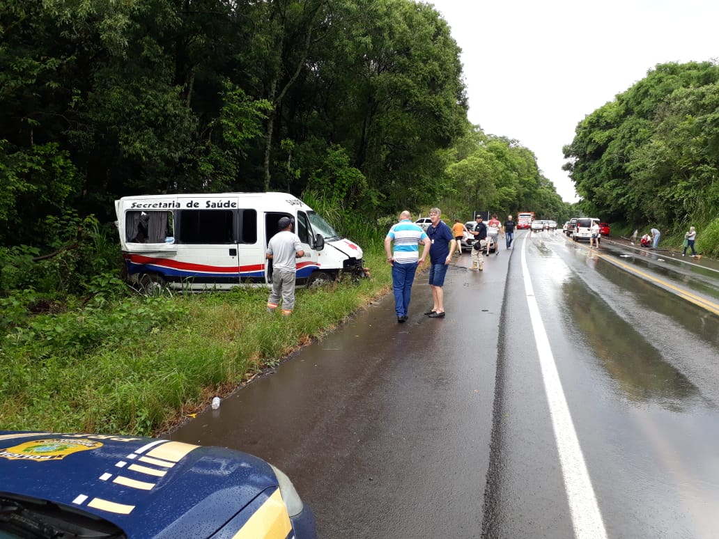Conforme as informações, a Van da Secretaria de Saúde de Cunha Porã retornava de Florianópolis, rodou na pista e colidiu contra o barranco.