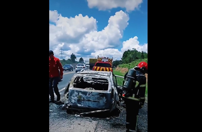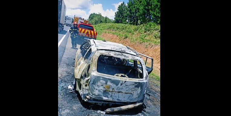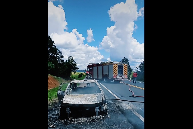 Veículo é destruído por incêndio na BR-282; bombeiros de Irani foram acionados