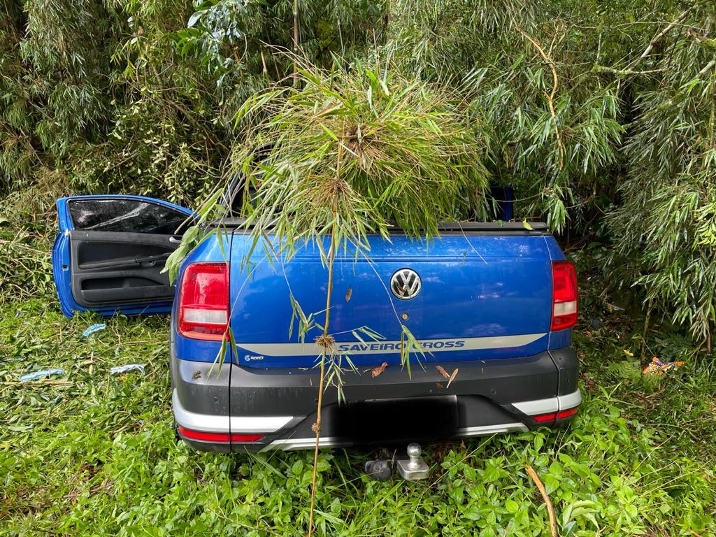 Ao chegar no local, a guarnição deparou-se com um VW Saveiro Cross com placas de Fraiburgo, que havia saído da pista e colidido em árvore.