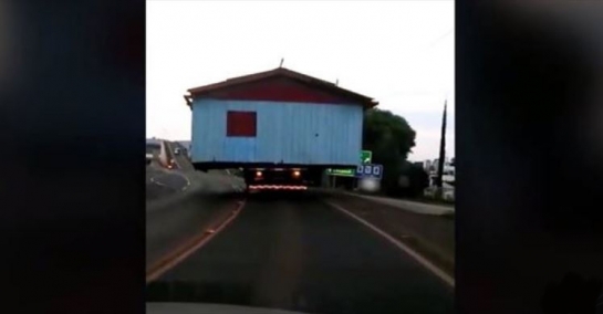 As imagens de uma casa sendo transportada por um caminhão pelas rodovias SC-157 e BR-480, no sentido Coronel Freitas a Chapecó, viralizou nas redes sociais. O vídeo, além de curioso, mostra o risco que tal prática representa.