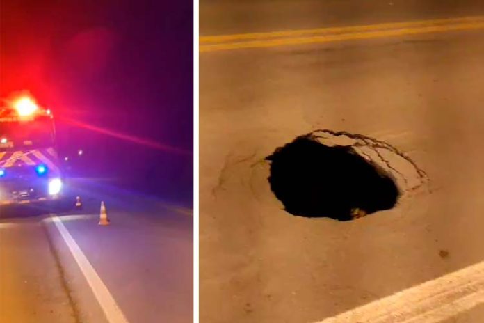Por volta das 21h30 desta sexta-feira (20), o Corpo de Bombeiros Voluntários da União (Ascurra, Apiúna e Rodeio) foi acionado para verificar uma cratera que se formou no Km 99 da BR-470, no bairro Estação, em Ascurra (SC).