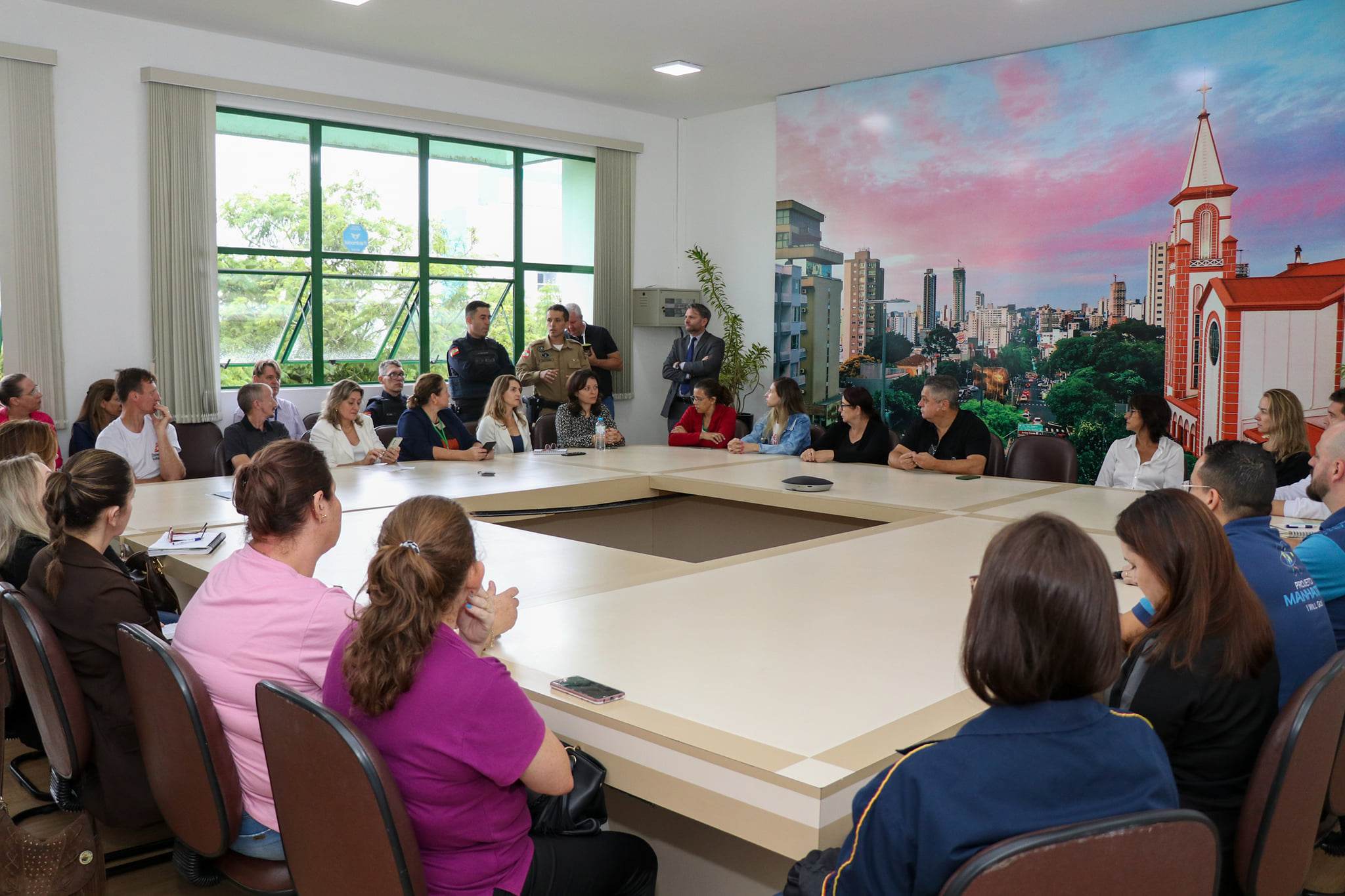 Antes da reunião com os guardas e vigias, também foi realizado uma reunião com representantes das escolas particulares, Secretaria de Educação do Município e Secretaria de Estado da Educação.