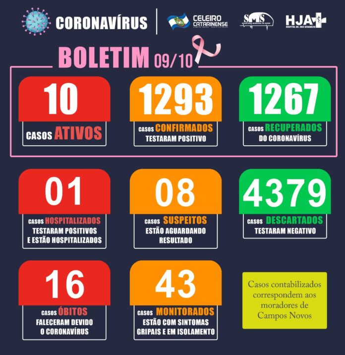 Campos Novos – Na tarde de ontem (08), o município registrava um dos menores números de casos ativos para Coronavírus dos últimos meses, já no boletim da tarde de hoje, 09/10, um dia depois, os pacientes ativos para a doença praticamente dobraram, passaram de 04 para 10 casos ativos no município. Alguns fatores podem ter sido determinantes para o aumento do número de casos ativos, os mais possíveis estão atribuídos ao relaxamento dos cuidados pessoais no enfrentamento à doença.
